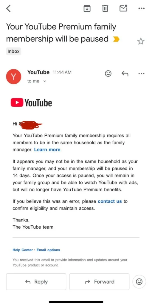 Korisnici koji dele YouTube Premium Family nalog, ali nisu fizički u istom domaćinstvu kao “porodični menadžer” (osoba koja je kreirala plan), počeli su da dobijaju obaveštenje da će im članstvo biti pauzirano za 14 dana. U obaveštenju jasno stoji da korišćenje Premium Family paketa van domaćinstva krši uslove korišćenja.